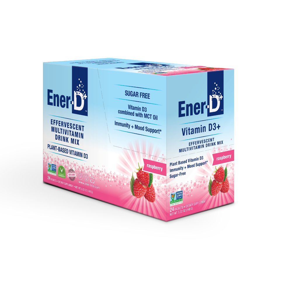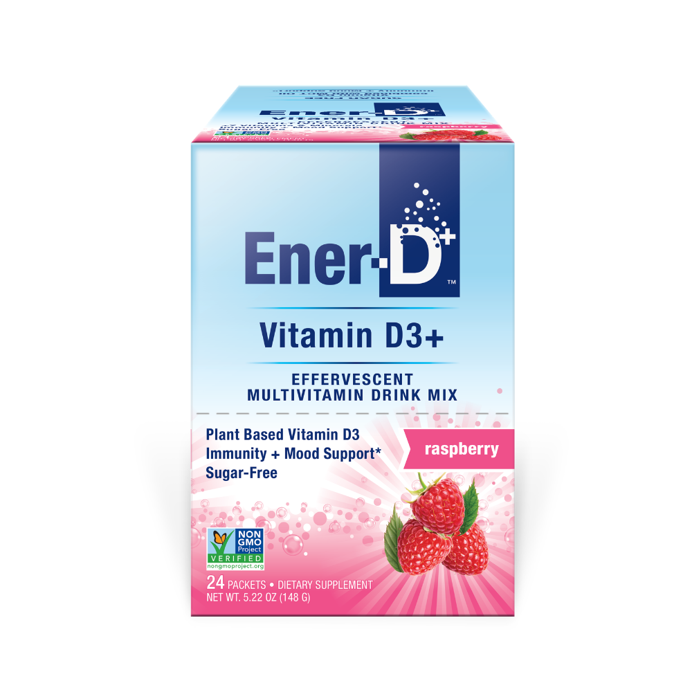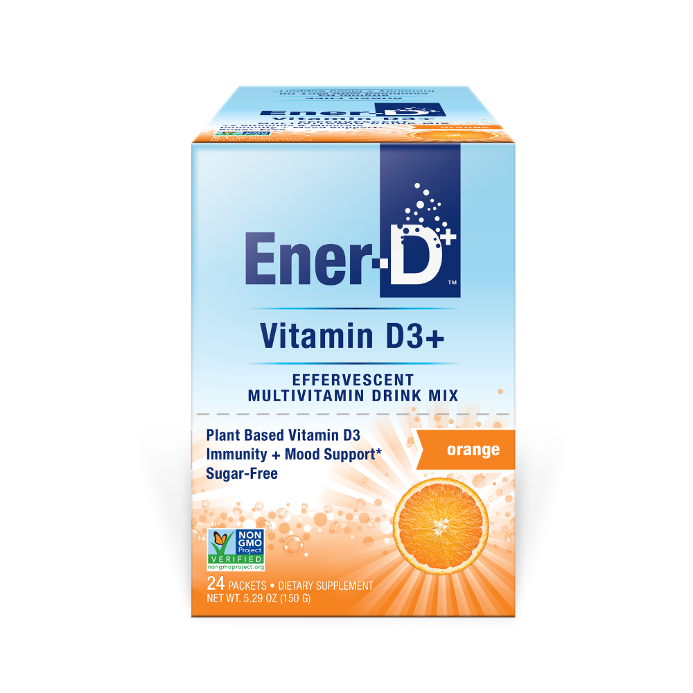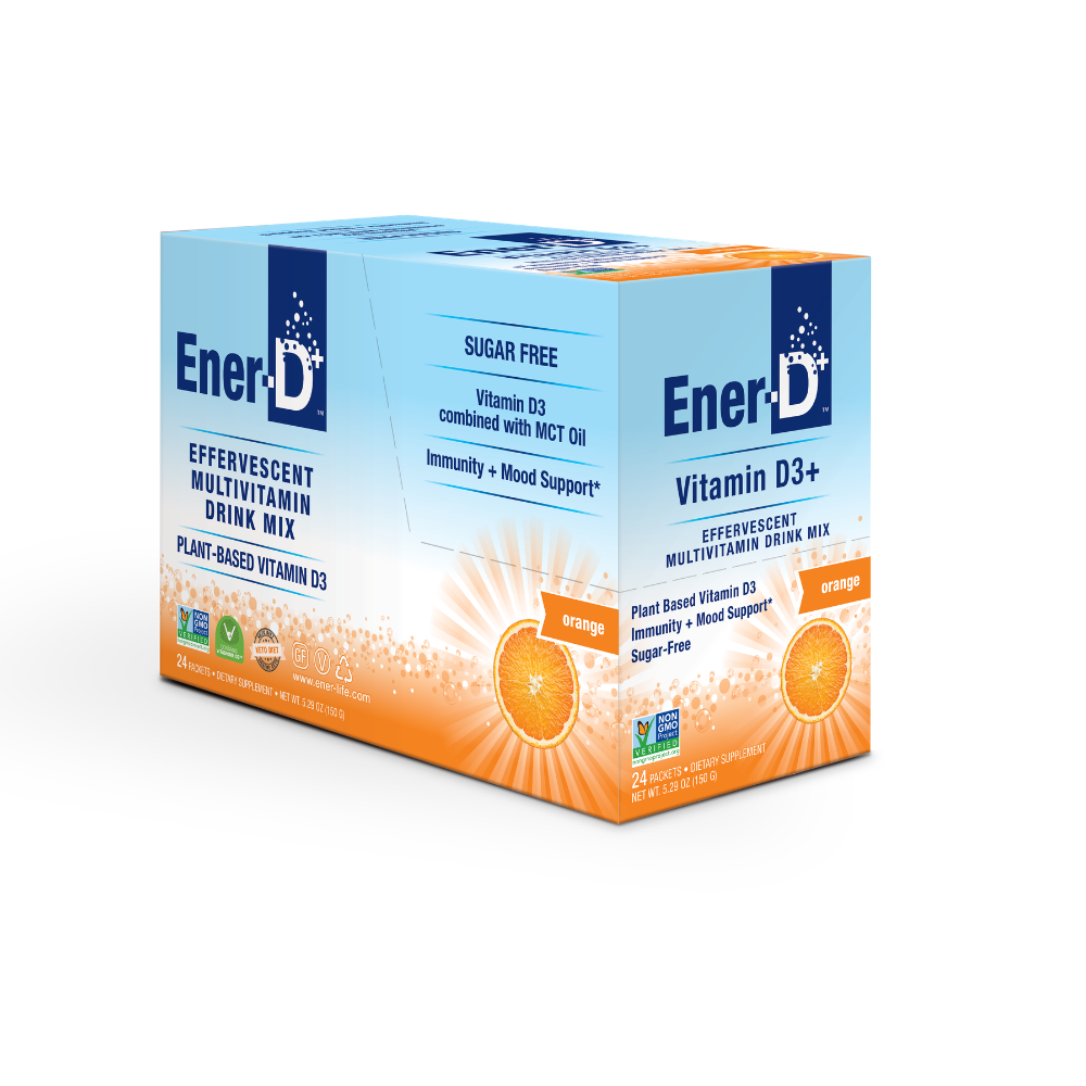 Ener-D Vitamin D Drink Mix is a deliciously effervescent and all-natural, sugar-free and Non-GMO formula for immune support. Made with 1000iu of plant-based Vitamin D3 sprayed with MCT oil for optimal absorption, plus added Beta Carotene, Magnesium and Calcium plus Vitamins C, B and Zinc.
